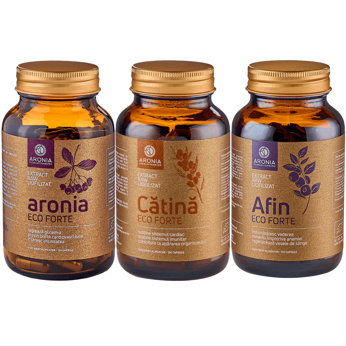 3 flacoane cu capsule din fructe de Aronia, Cătină și Afine, ideale pentru un stil de viață echilibrat. - Realizate din fructe proaspete de aronia, cătină și afine. - De 5 ori mai concentrate decât alte capsule de pe piață. - Sursă naturală de vitamine, minerale și antioxidanți. - Certificate ecologic de Bio Garantie și notificate de SNPMAPS. - Fără gluten, lactoză, conservanți sau coloranți. - Conțin 120 capsule per flacon, cu 400 mg per capsulă.